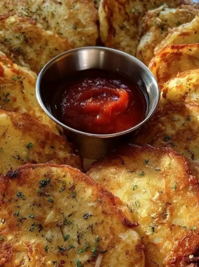 The potato pancakes have a crispy exterior and a tender interior. The recipe uses basic, pantry-staple ingredients. The cooking process is straightforward and results in a versatile side dish or appetizer.