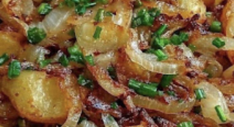- Continue cooking until onions are soft and caramelized, and potatoes are cooked through.