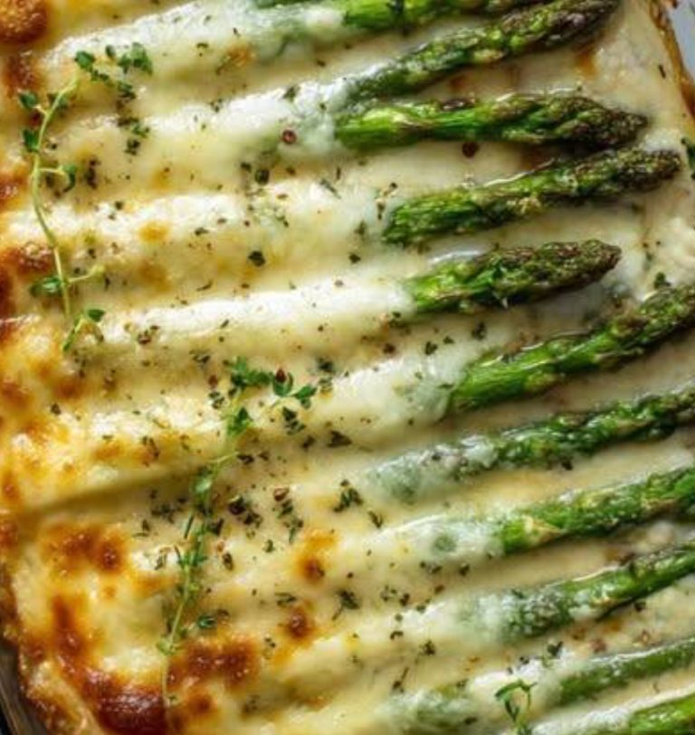 Heat the oven to 400 degrees. – Wash and trim the asparagus, then grease a 9 x 13 baking tray and place them in it. In a skillet, melt the butter over medium heat, then add the soft cheese, heavy whipping cream, chicken broth, garlic powder, paprika, Italian seasoning, salt, and pepper. Stirring constantly until ingredients are well blended.