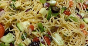 Ingredients: °1 lb spaghetti, cook & drain °1 1/2 cup cherry tomatoes, halved °1 cucumber, diced °2 zucchini, diced °1…